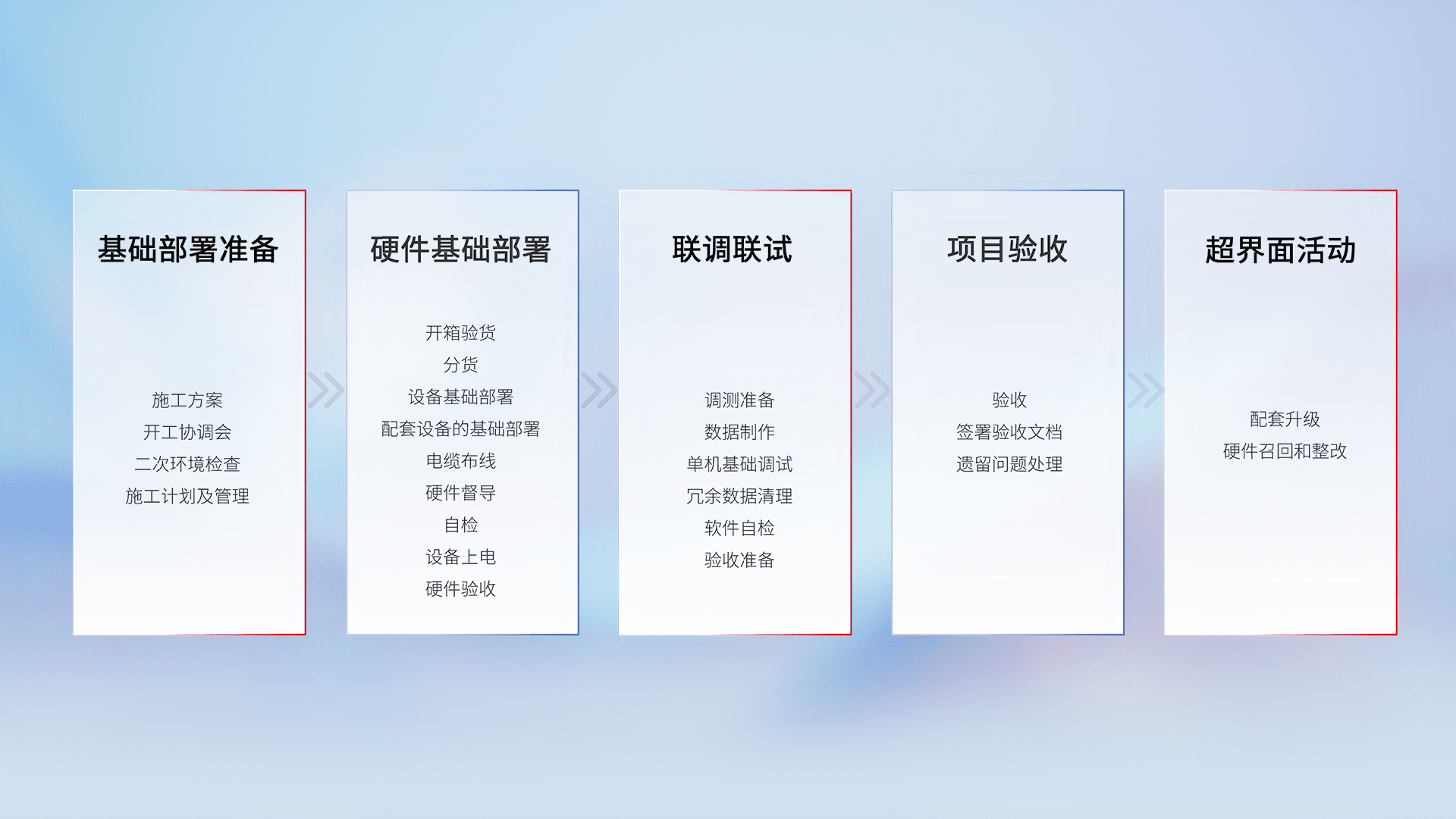 从基础部署准备、、、硬件基础部署、、、联调联试、、项目验收、、、、越界面活动的全过程可追溯,,保证施工质量和进度。。